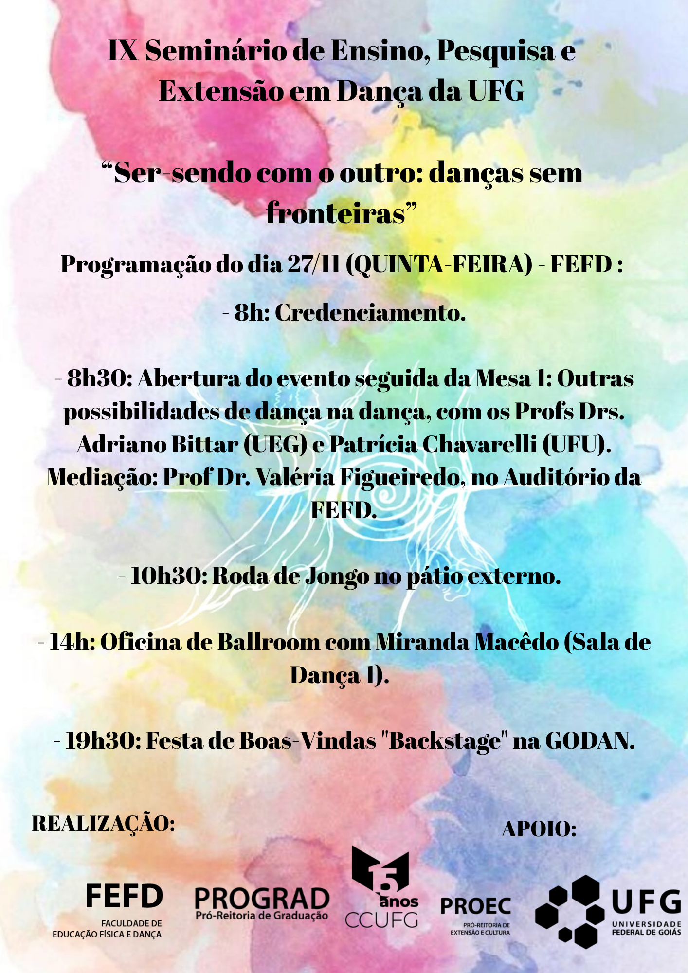 cartaz colorido com letras na cor preta contendo as informações do primeiro dia de evento